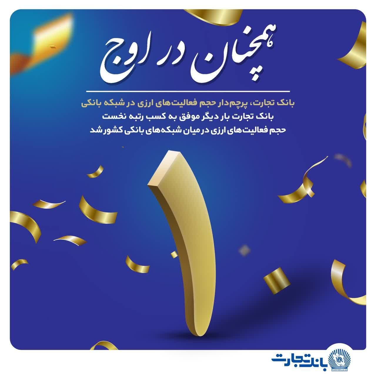 بانک تجارت که در سال گذشته موفق به کسب رتبه نخست فعالیت‌های ارزی در میان بانک‌های کشور شده بود، در سه‌ماهه اول سال 1402 نیز موفق به تکرار دستاورد سال گذشته و کسب مجدد رتبه اول در شبکه بانکی کشور شد.